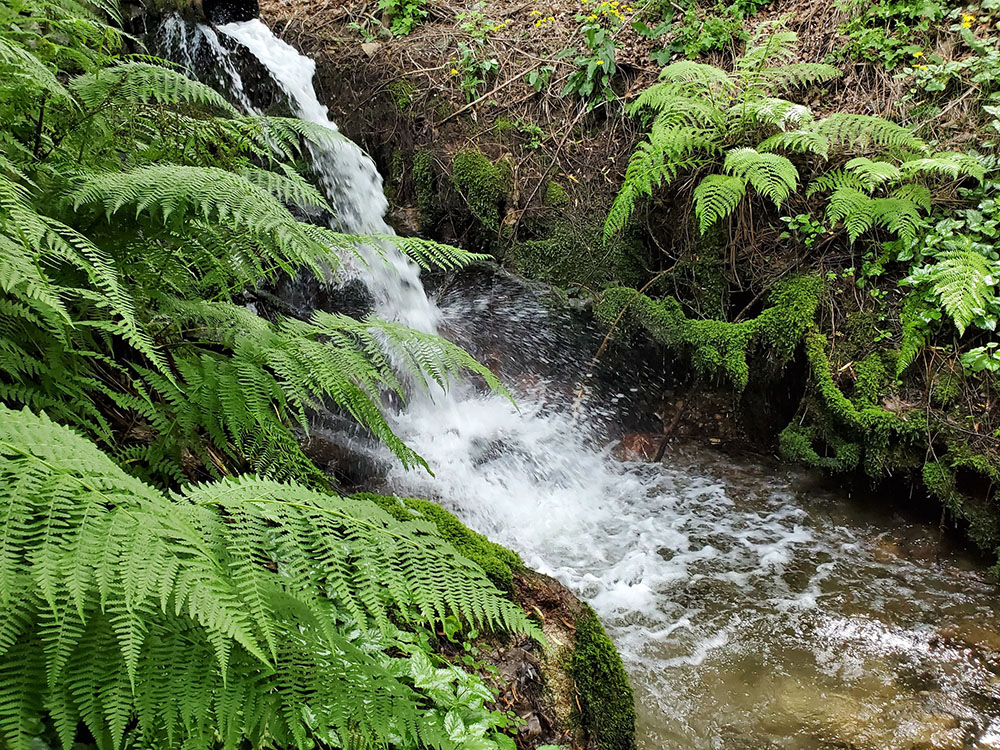 - Scenic views of gardens, creek, waterfall, mountains, and lake